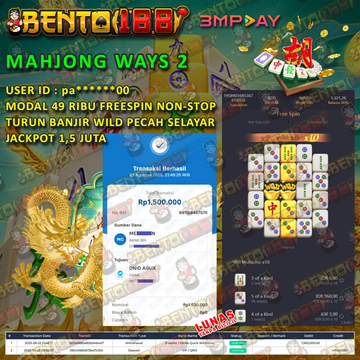 Bento188 adalah situs slot gacor yang pemainnya bebas bermain di permainan apapun karena dijamin gacor. Baru bermain 20 menit saja di Gates of Olympus 1000 tanpa pakai pola apapun dapat pecah luar perkalian besar X600 langsung sukses WD 1,9 jutaan.